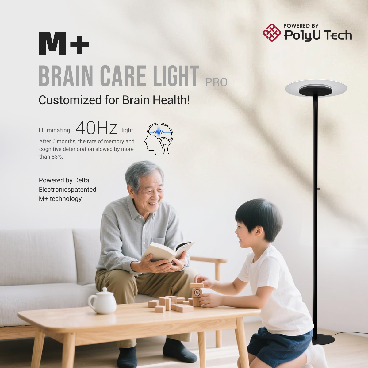- M+護智燈 PRO 使用專利的複頻技術,在正常的燈光中融入40 Hz 頻率的光波,讓使用者可以在日常使用人工照明,同時接受 40 Hz 的光照刺激,不受閃爍問題困擾。